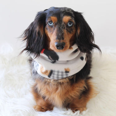 A cute dachshund snood scarf to keep your dog warm this winter. This snood scarf acts as a neck warmer to keep your pooch toasty on cold days. It can also go over your dog's ears to keep them warm on particularly chilly days.