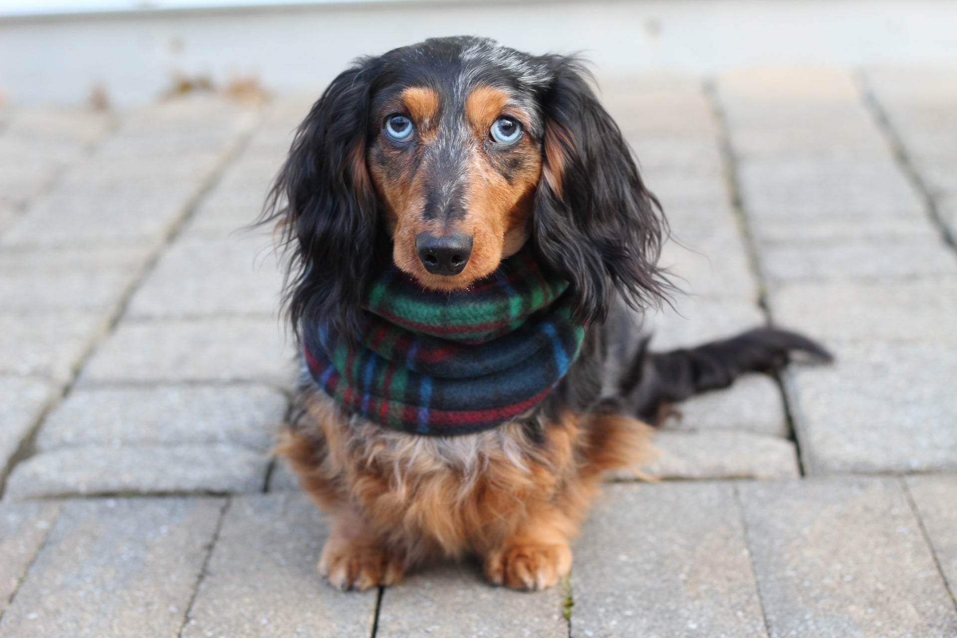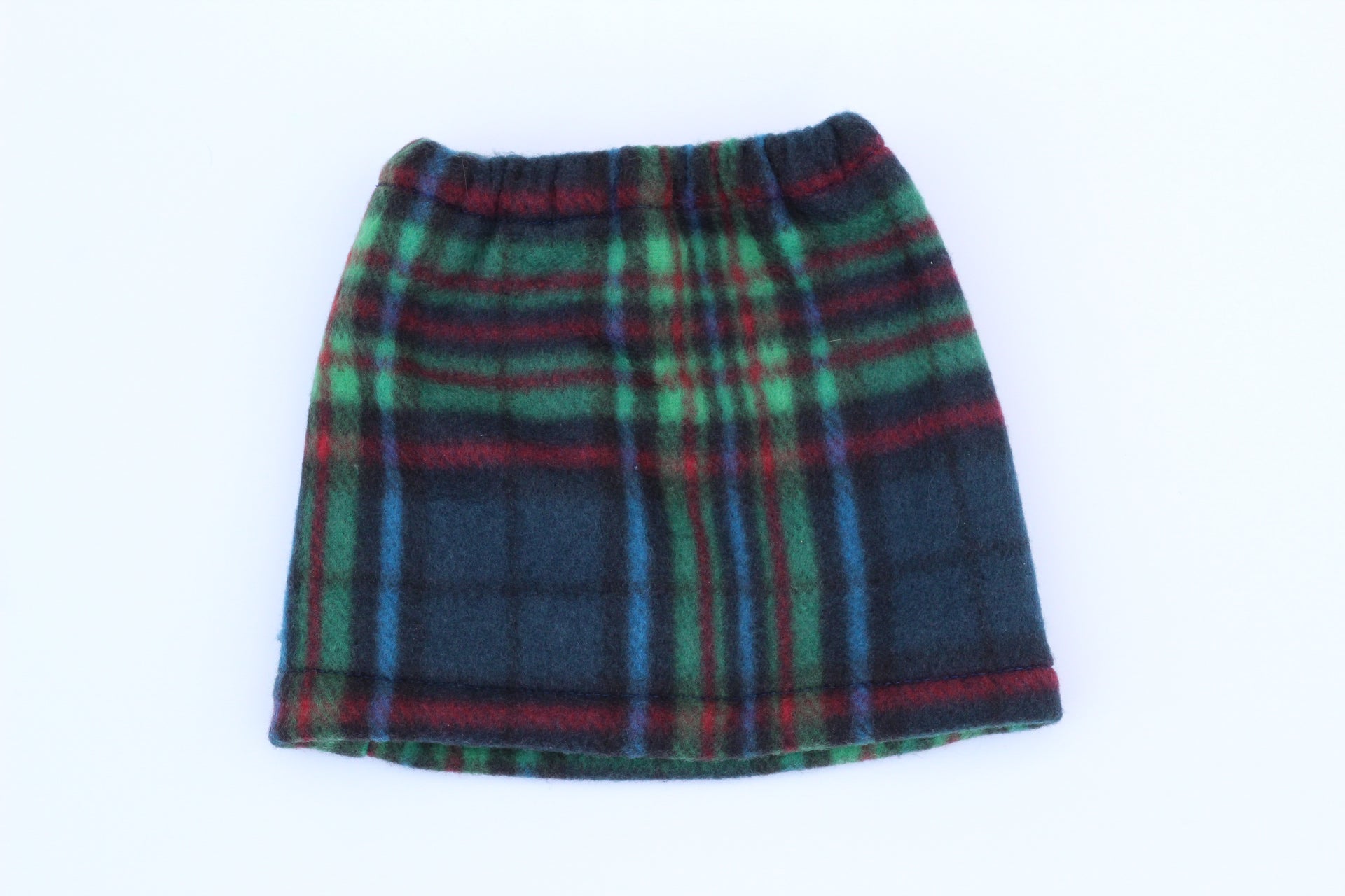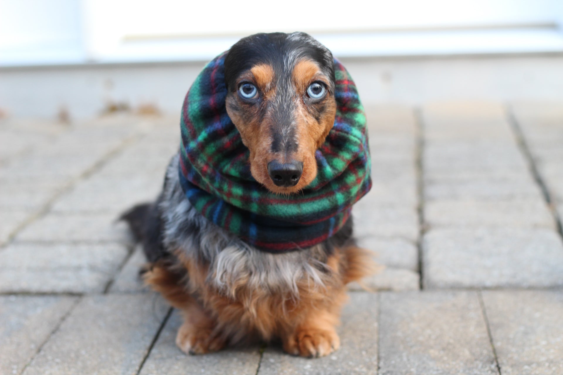 A cute Blue, Green, and Red Plaid Dog Snood Scarf to keep your dog warm this winter. This snood scarf acts as a neck warmer to keep your pooch toasty on cold days. It can also go over your dog's ears to keep them warm on particularly chilly days.